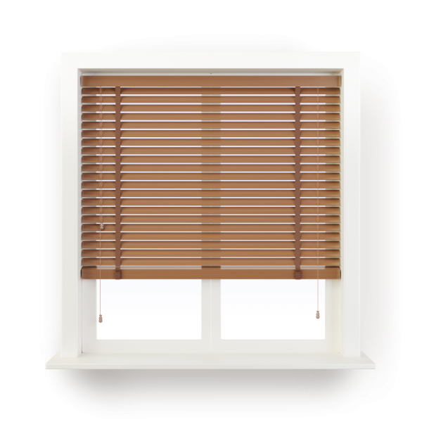 This beautiful wood blind is from our Stained Wood Blind range. With gloss stain allowing the beauty of the wood grain to show through, these blinds will bring an air of elegance to your window. Produced with colour matching pelmet and available with matching fabric tape to added privacy and style.